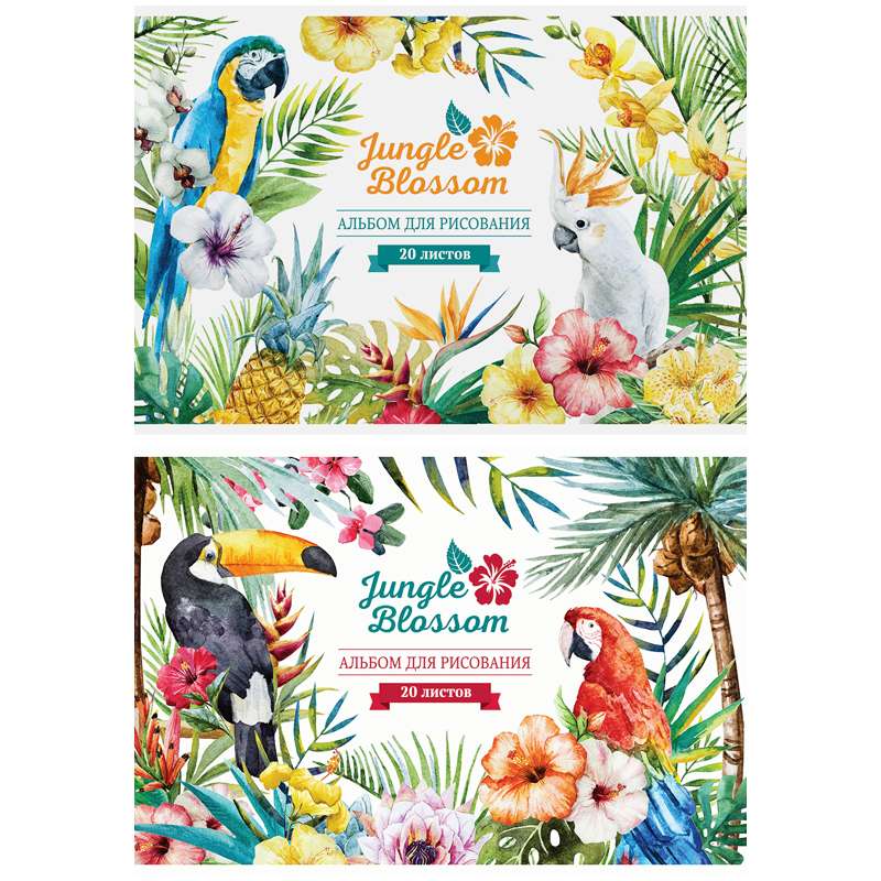 Альбом для рисования формата А4 в обложке из импортного мелованного картона. Внутренний блок из 20 листов офсетной бумаги на скобе. Плотность бумаги — 100 г/кв.м, соответствует Техническому регламенту «О безопасности продукции, предназначенной для детей и подростков». Подходит для рисования различными типами красок, фломастерами, цветными и чернографитными карандашами, гелевыми ручками.Альбом для рисования 20л. А4 на скрепке "Цветы. Jungle blossom", глянцевый лак