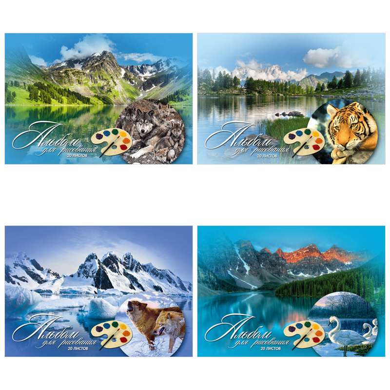 Формат А4. Вид крепления -скрепка. Обложка - мелованный картон улучшенного качества с эффектом "лен". Внутренний блок -офсетный, 100 г/м2.Альбом для рисования 20л. А4 на скрепке "Природа и животные", лен