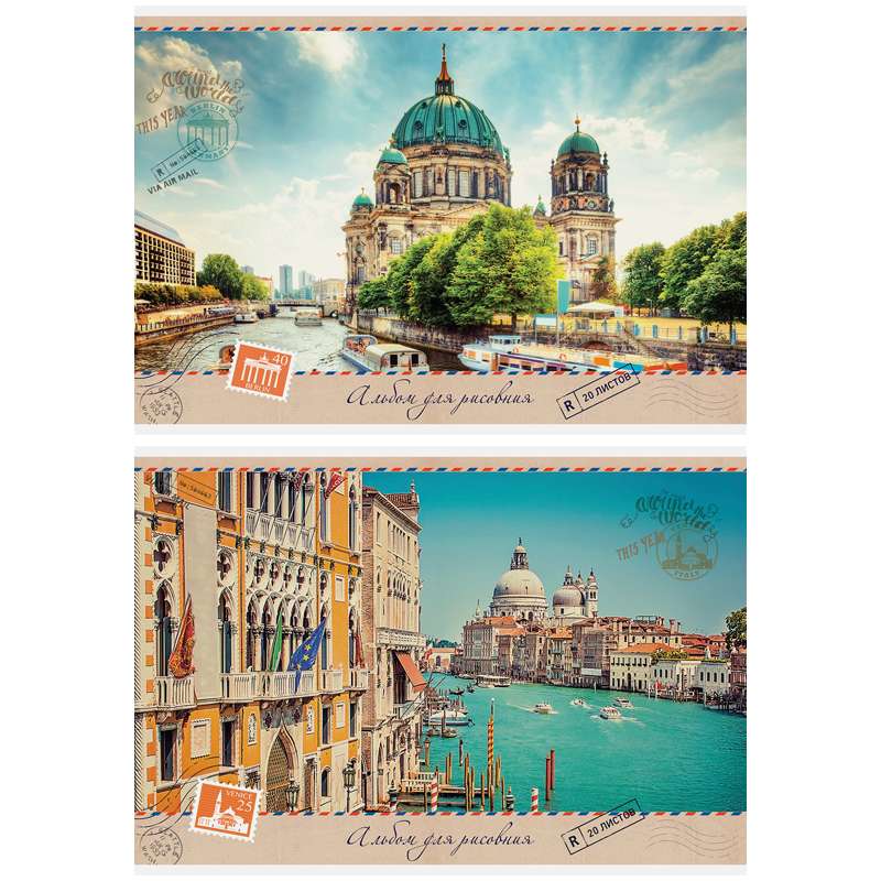 Альбом для рисования формата А4 в обложке из импортного мелованного картона. Внутренний блок из 20 листов офсетной бумаги на скобе. Плотность бумаги — 100 г/кв.м, соответствует Техническому регламенту «О безопасности продукции, предназначенной для детей и подростков». Подходит для рисования различными типами красок, фломастерами, цветными и чернографитными карандашами, гелевыми ручками.Альбом для рисования 20л. А4 на скрепке "Путешествия. Air mail", обл. офсет