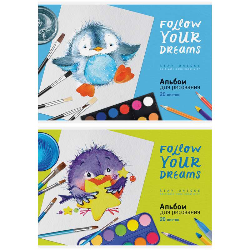 Альбом для рисования формата А4 в обложке из импортного мелованного картона. Внутренний блок из 20 листов офсетной бумаги на скобе. Плотность бумаги — 100 г/кв.м, соответствует Техническому регламенту «О безопасности продукции, предназначенной для детей и подростков». Подходит для рисования различными типами красок, фломастерами, цветными и чернографитными карандашами, гелевыми ручками.Альбом для рисования 20л. А4 на скрепке "Рисование. Follow you dreams"