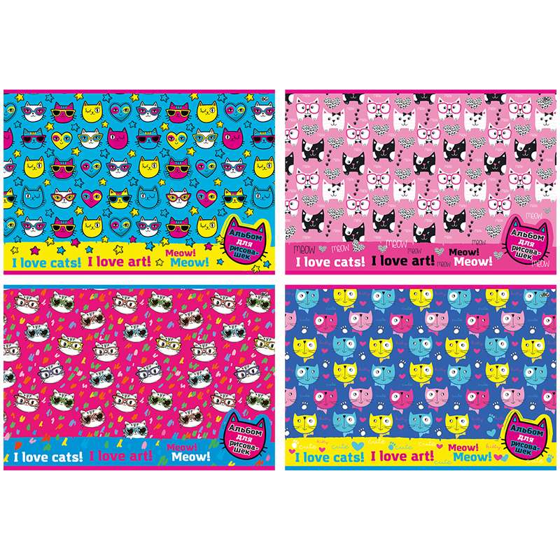 Формат А4. Вид крепления -скрепка. Обложка -мелованный картон. Внутренний блок -офсет 100 гр/м2.Альбом для рисования 24л. А4 на скрепке "I love cats"