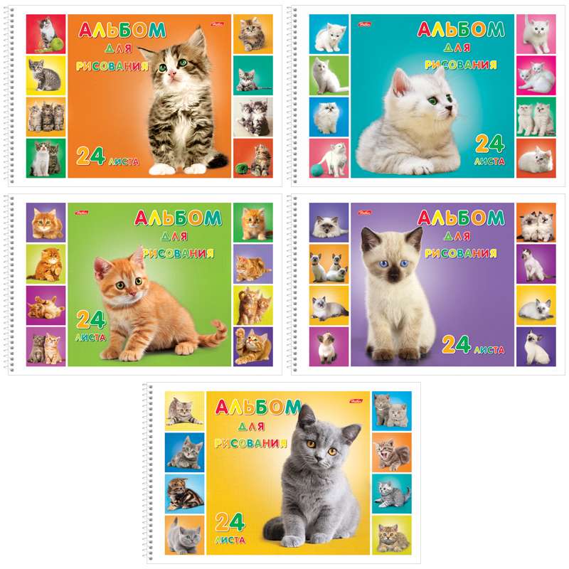 Альбом для рисования. Блок листов - офсетная бумага, формат А4, 24 листа. Обложка- мелованный картон.Альбом для рисования 24л., А4, на спирали Hatber "Милые котята", перфорация на отрыв