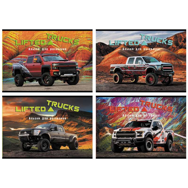 Формат А4. Внутренний блок -офсет 100 гр/м2. Вид крепления -гребень. Обложка -мелованный картон. Внутренний -блок -офсетный, плотностью 100 г/м2. Белизна внутреннего блока -92%.Альбом для рисования 32л. А4 на гребне "Trucks", эконом