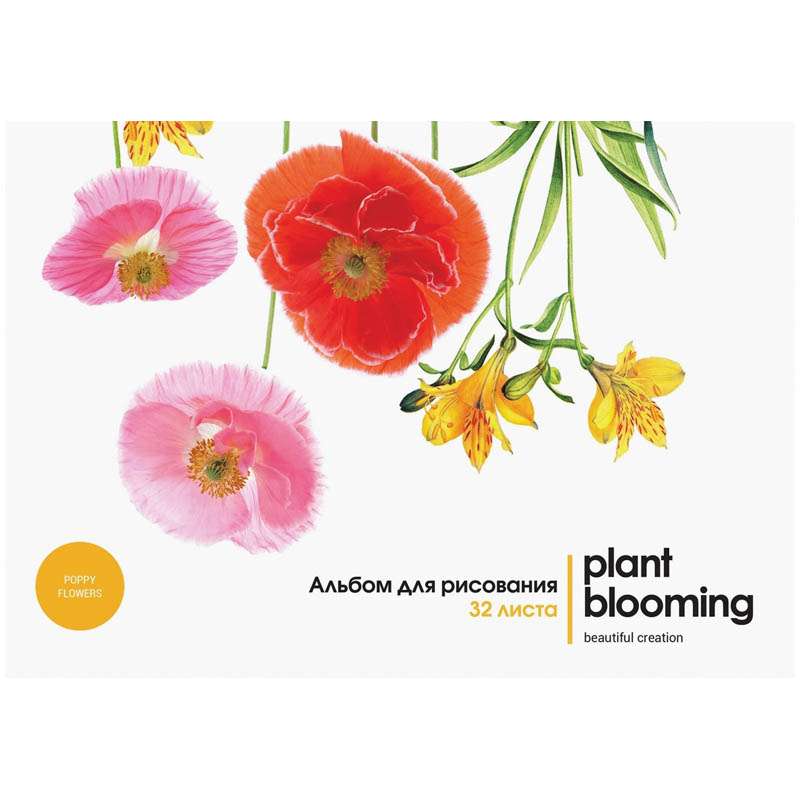 Внутренний блок – офсет 100 г/м². Обложка – мелованный картон, ВД-лак. Объем блока – 32 л. Формат А4.Альбом для рисования 32л. А4 на склейке "Цветы. Plant blooming", блок 100 г/м2, ВД-лак