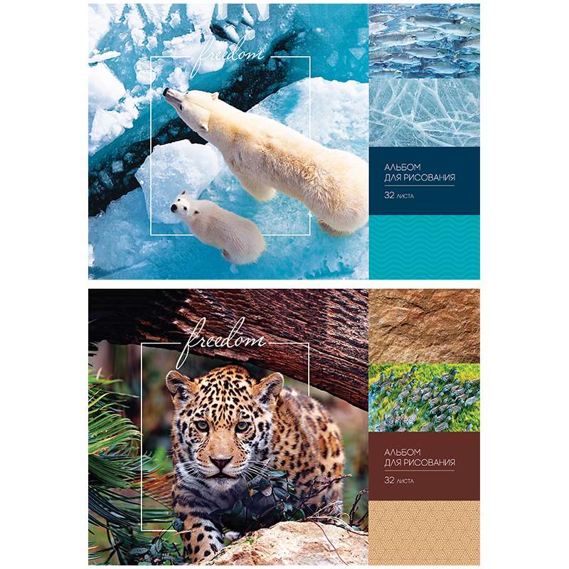Альбом для рисования формата А4 в обложке из мелованного картона. Внутренний блок из 32 листов офсетной бумаги на склейке. Плотность бумаги — 100 г/кв.м, соответствует Техническому регламенту «О безопасности продукции, предназначенной для детей и подростков». Подходит для рисования различными типами красок, фломастерами, цветными и чернографитными карандашами, гелевыми ручками. Отделка обложки – водный лак.Альбом для рисования 32л. А4 на склейке "Природа. Freedom"