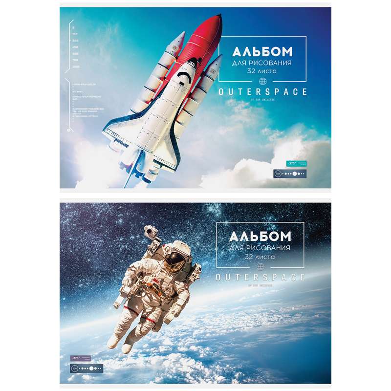 Альбом для рисования формата А4 в обложке из импортного мелованного картона. Внутренний блок из 32 листов офсетной бумаги на скобе. Плотность бумаги — 100 г/кв.м, соответствует Техническому регламенту «О безопасности продукции, предназначенной для детей и подростков». Подходит для рисования различными типами красок, фломастерами, цветными и чернографитными карандашами, гелевыми ручками.Альбом для рисования 32л. А4 на скрепке "Космос. Outerspace", выборочный УФ-лак