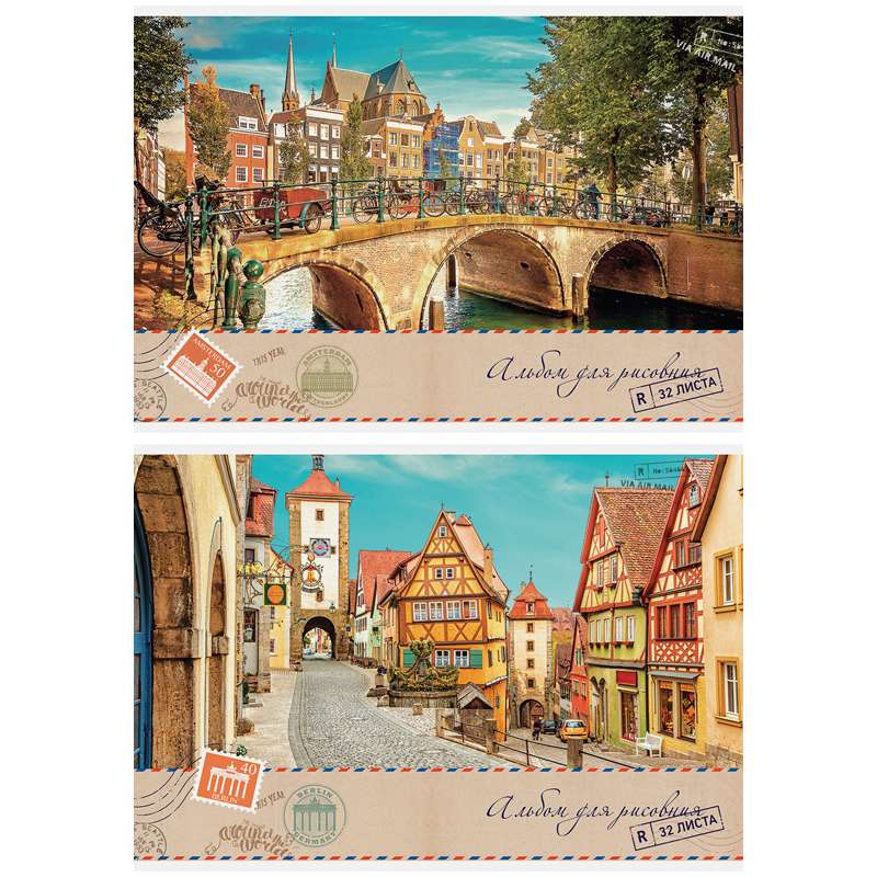 Альбом для рисования формата А4 в обложке из импортного мелованного картона. Внутренний блок из 32 листов офсетной бумаги на скобе. Плотность бумаги — 100 г/кв.м, соответствует Техническому регламенту «О безопасности продукции, предназначенной для детей и подростков». Подходит для рисования различными типами красок, фломастерами, цветными и чернографитными карандашами, гелевыми ручками.Альбом для рисования 32л. А4 на скрепке "Путешествия. Air mail", выборочный УФ-лак