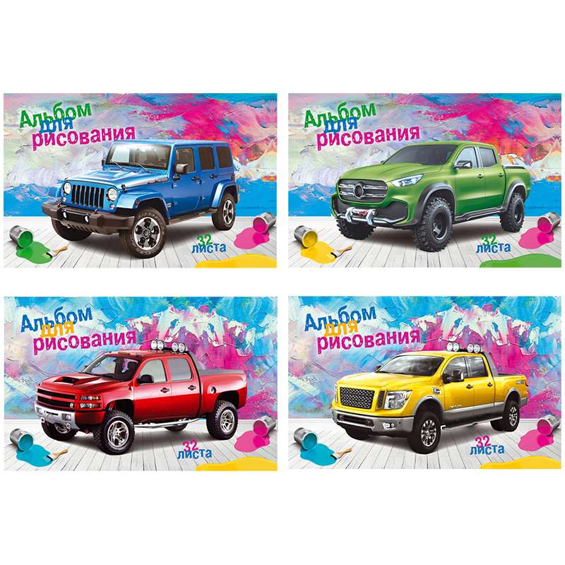 Формат А4. Вид крепления -скрепка. Обложка- мелованный картон. Внутренний блок -офсетный, 100 гр/м2. Белизна внутреннего блока -92%.Альбом для рисования 32л. А4 на скрепке "Раскрась джип!", эконом
