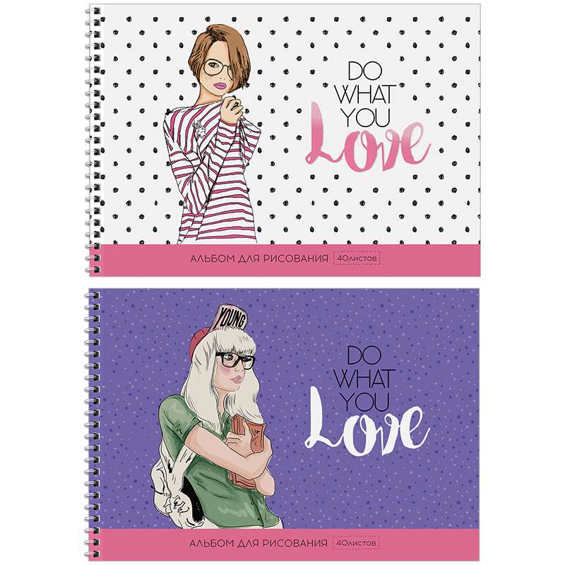 Альбом для рисования формата А4 в обложке из импортного мелованного картона. Внутренний блок из 40 листов офсетной бумаги на двойной евроспирали. Плотность бумаги — 100 г/кв.м, соответствует Техническому регламенту «О безопасности продукции, предназначенной для детей и подростков». Подходит для рисования различными типами красок, фломастерами, цветными и чернографитными карандашами, гелевыми ручками. Отделка обложки – ВД-лак.Альбом для рисования 40л. А4 на гребне "Модные девчонки. Do what you love"