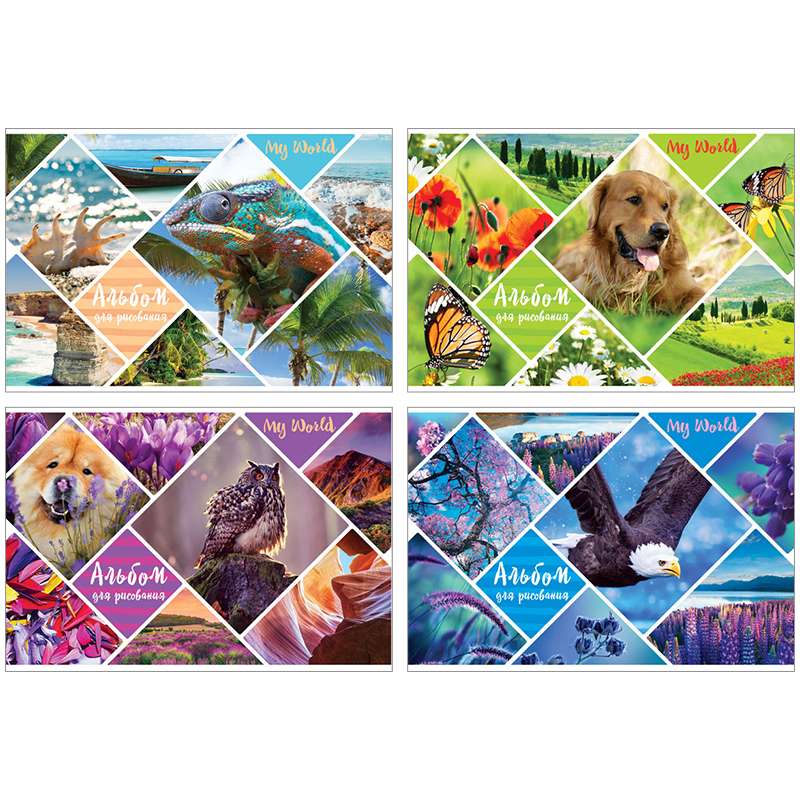 Альбом для рисования А4 формата. Вид крепления - на скрепке. Обложка - мелованный картон. Внутренний блок -офсетный, плотностью 100 гр/м2. Белизна внутреннего блока -92%.Альбом для рисования 40л. А4 на скрепке "My world", эконом