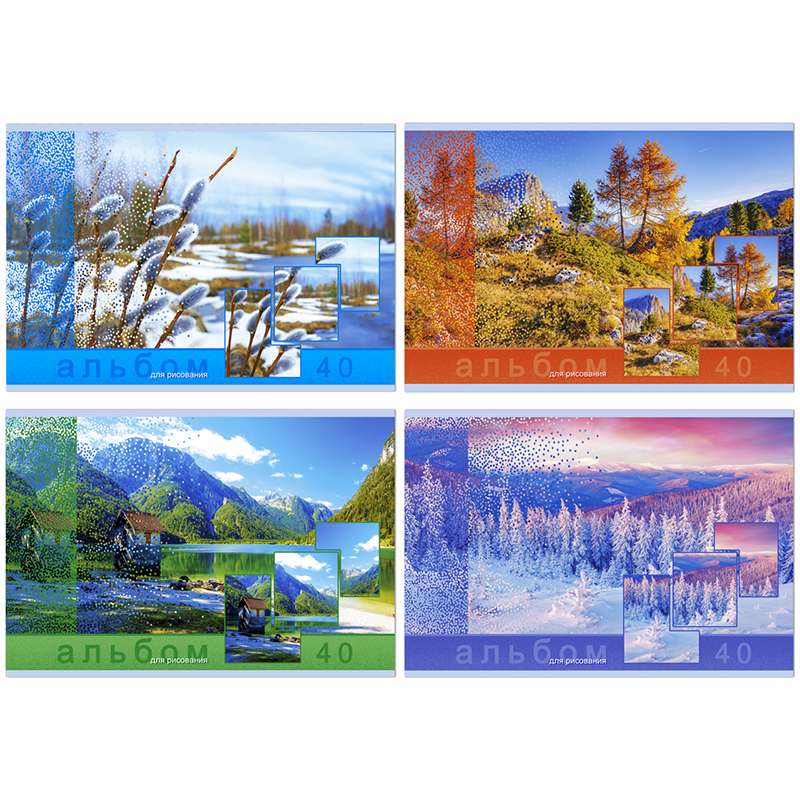 Формат А4. Вид крепления - скрепка. Обложка -мелованный картон. Внутренний блок -офсетный 100 гр/м2Альбом для рисования 40л. А4 на скрепке "Времена года"