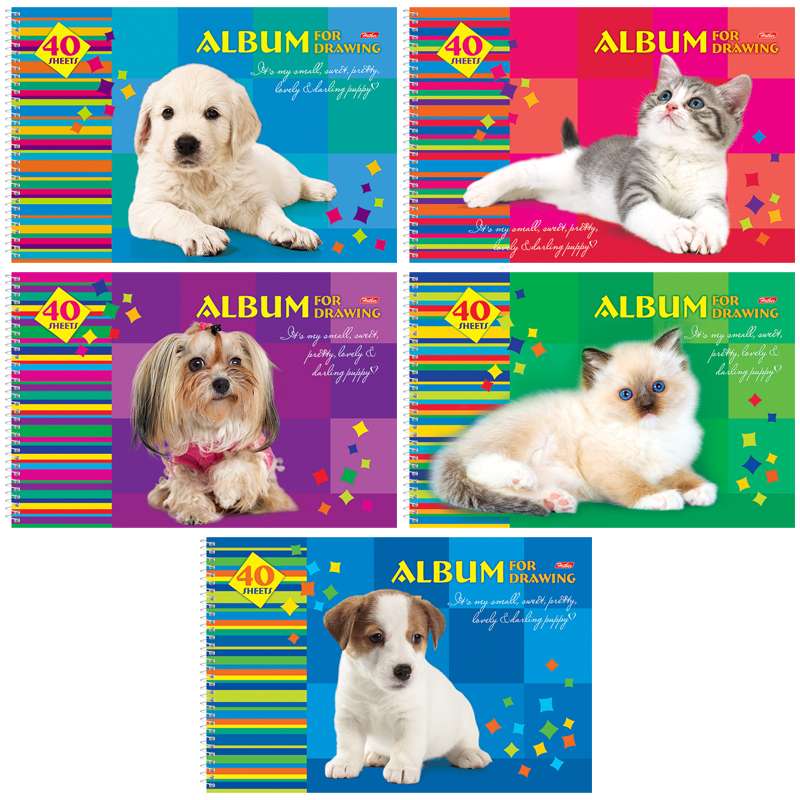 Альбом для рисования. Блок листов - офсетная бумага, формат А4, 40 листов. Перфорация листов для удобного отделения готовых рисунков. Альбом на гребне, обложка - мелованный картон.Альбом для рисования 40л. А4 на спирали "Любимцы", перфорация на отрыв