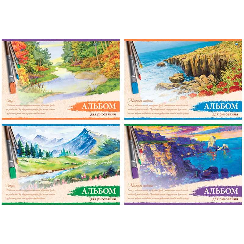 Формат А4. Вид крепления -гребень. Обложка -мелованный картон. Внутренний блок - офсетный, 100 г/м2. Белизна внутреннего блока -92%.Альбом для рисования 48л. А4 на гребне "Живопись", эконом