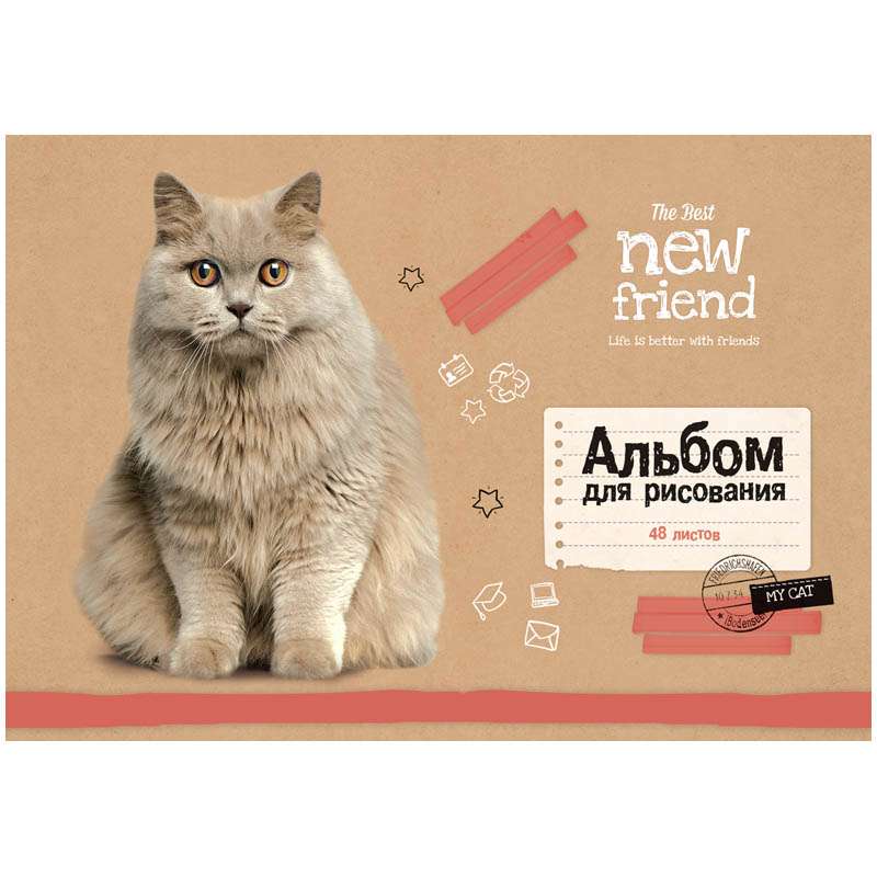 Внутренний блок – офсет 100 гр/м2. Обложка – мелованный картон. Объем блока – 48 л. Формат А4.Альбом для рисования 48л. А4 на гребне "Питомцы. The best friends"
