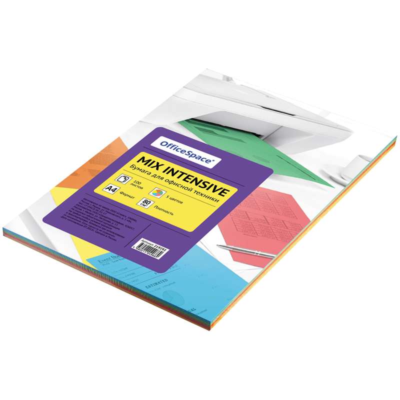 Цветная бумага формата А4, плотность 80 г/м2, интенсив микс 5 цветов, 100 листов, упаковка - т/у пленка.219292 Бумага цветная OfficeSpace intensive mix А4 16л. 80г/м2, 100л. (5 цветов) 219292 [РЦ]
