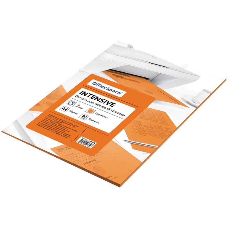 Цветная бумага формата А4, плотность 80 г/м2, цвет - оранжевый интенсив, 50 листов, упаковка - т/у пленка с картонной подложкой.Бумага цветная OfficeSpace intensive А4, 80г/м2, 50л. (оранжевый)
