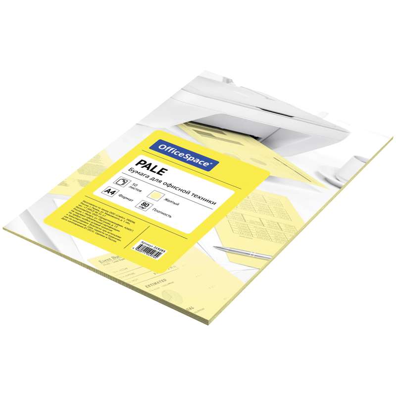 Цветная бумага формата А4, плотность 80 г/м2, цвет - желтый пастель, 50 листов, упаковка - т/у пленка с картонной подложкой.Бумага цветная OfficeSpace pale А4, 80г/м2, 50л. (желтый)