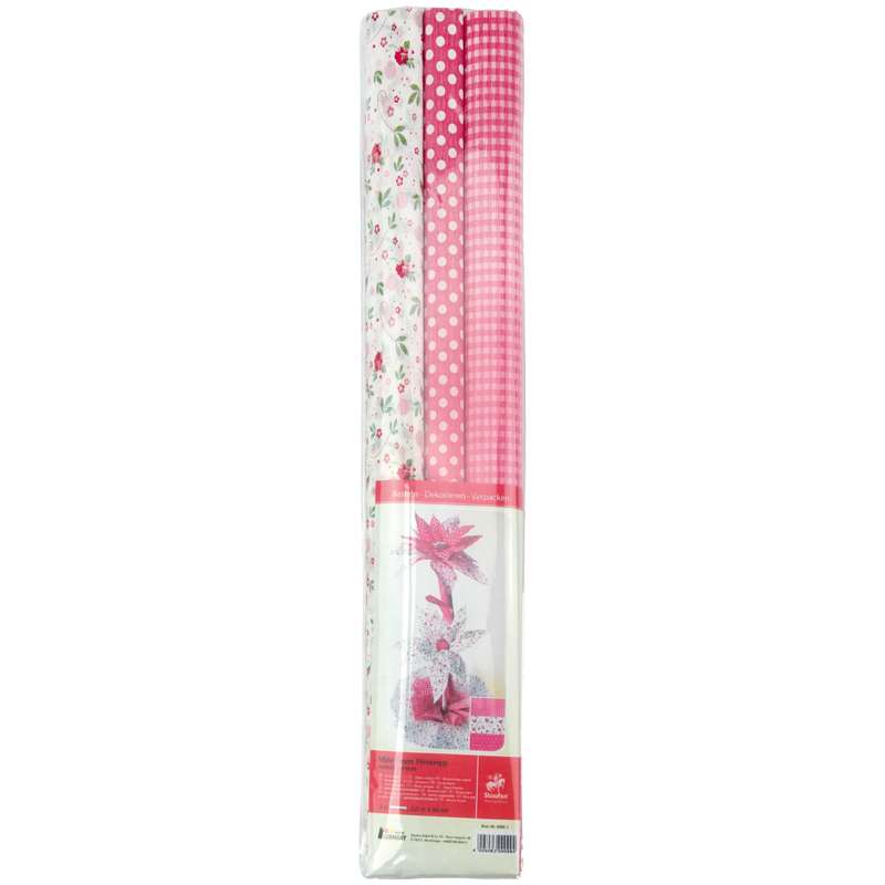 Бумага с экслюзивными дизайнерскими принтами, плотная, светостойкая, выпускается экологически чистым способом, не содержит токсичных и канцерогенных материалов. Используется для оформления подарков, интерьеров, букетов, в технике скрапбукинг, декупаж. Рисунок: 1. белый горошек на розовом фоне. 2. белая клетка на розовом фоне. 3. Цветы в красно-зеленой гаммеНабор крепированной бумаги 50*200 см, 35 г/м2, растяжение 35%, 3 шт., бело-розовая, в рулонах
