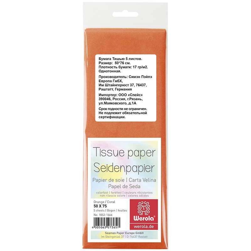 Главная / Товары / КАНЦТОВАРЫ / УПАКОВКА / ХОЗ ТОВАРЫ / РАСХОДНЫЕ МАТЕРИАЛЫ / Канцелярские товары - Школьные / Бумажная продукция для поделок / Бумага тишью / Бумага тишью Werola, 50*75см, 5 листов, 17г/м2, оранжевая, однотонная, пакет, европодвес