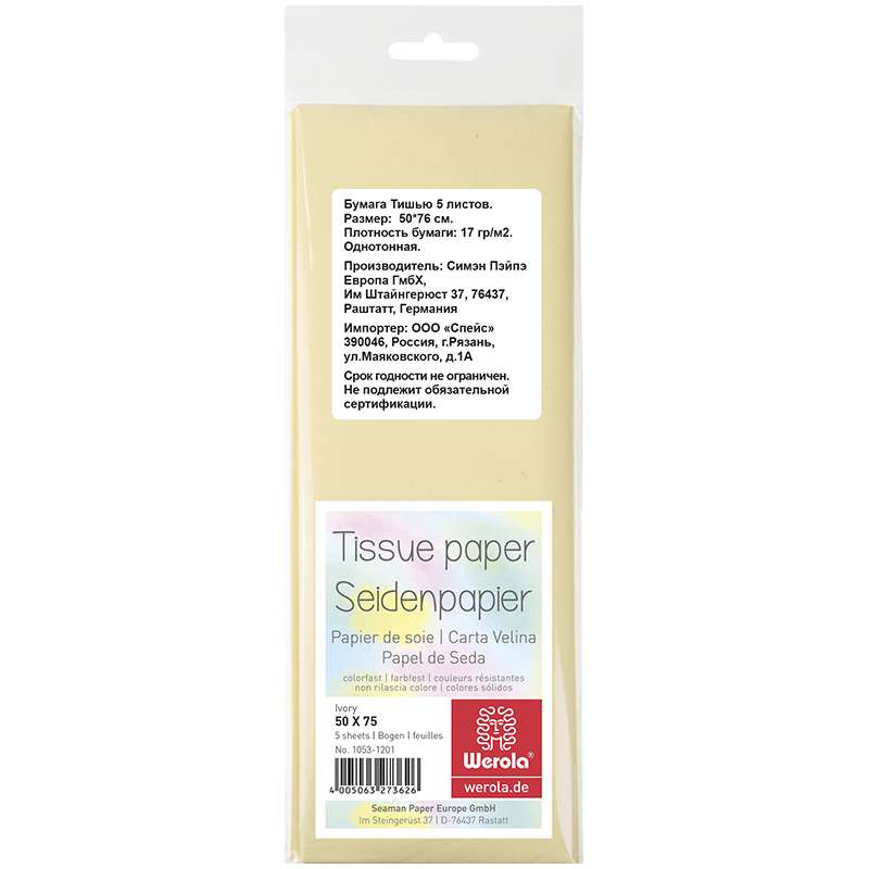 Главная / Товары / КАНЦТОВАРЫ / УПАКОВКА / ХОЗ ТОВАРЫ / РАСХОДНЫЕ МАТЕРИАЛЫ / Канцелярские товары - Школьные / Бумажная продукция для поделок / Бумага тишью / Бумага тишью Werola, 50*75см, 5 листов, 17г/м2, слоновая кость, однотонная, пакет, европодвес