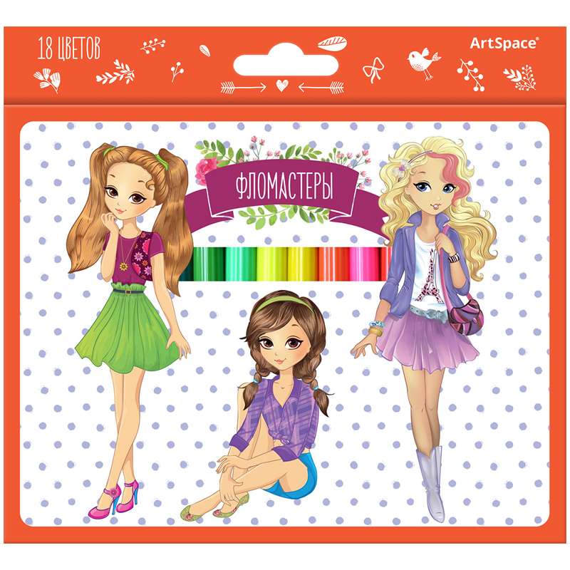 Набор фломастеров. 18 ярких цветов. Вентилируемый колпачок, смываемые чернила на водной основе. Упакованы в картонную коробку с подвесом.Фломастеры ArtSpace "Девочки", 18цв, картон, смываемые, европодвес