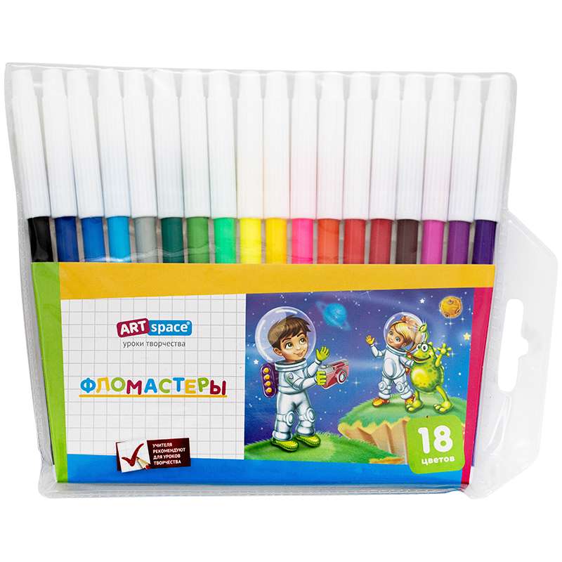 Набор фломастеров для детского творчества. Яркие цвета, невентилируемый колпачок, не токсичны.Фломастеры ArtSpace "Космонавты" 18цв, ПВХ, европодвес