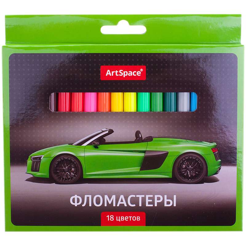 Набор фломастеров. 18 ярких цветов. Вентилируемый колпачок, смываемые чернила на водной основе. Упакованы в картонную коробку с подвесом.Фломастеры ArtSpace "Машинки", 18цв, смываемые, картон, европодвес