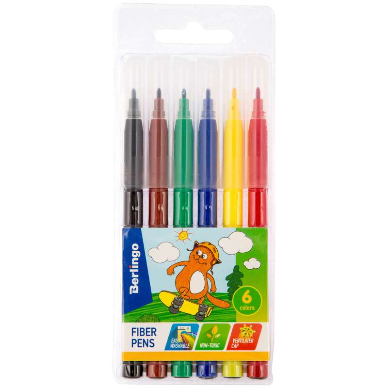 Легкосмываемые чернила, вентилируемый колпачок, нетоксичны, корпус изготовлен из полипропилена. Упакованы в блистер с петлей-европодвесом. Длина линии не менее 500 мФломастеры Berlingo "Жил-был кот", 06цв, смываемые, блистер