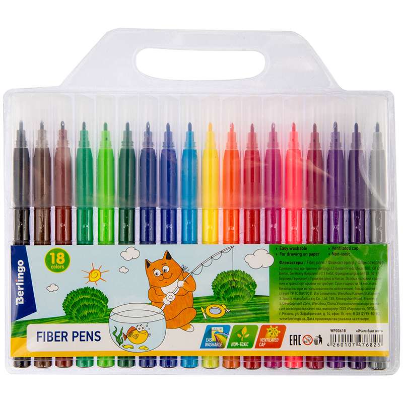 Легкосмываемые чернила, вентилируемый колпачок, нетоксичны, корпус изготовлен из полипропилена. Упакованы в блистер с петлей-европодвесом. Длина линии не менее 500 мФломастеры Berlingo "Жил-был кот", 18цв, смываемые, блистер