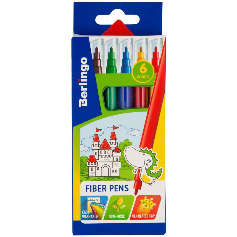 Легкосмываемые чернила, вентилируемый колпачок, нетоксичны, корпус изготовлен из полипропилена. Упакованы в картонную лакированную коробку с петлей-европодвесом. Длина линии не менее 500 м.Фломастеры Berlingo "Замки", 06цв, смываемые, картон, европодвес