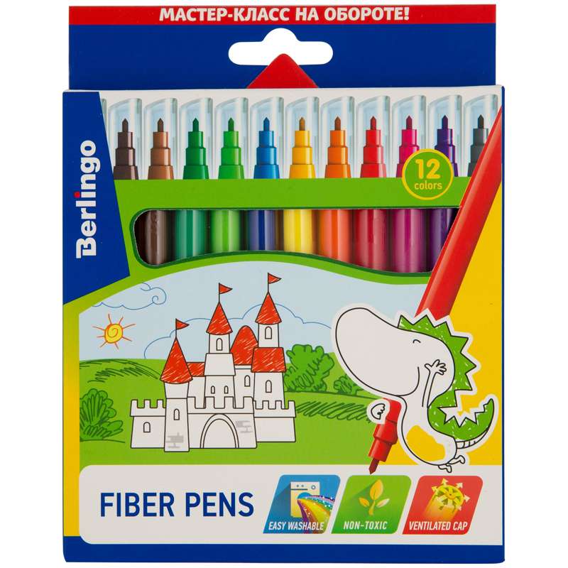 Легкосмываемые чернила, вентилируемый колпачок, нетоксичны, корпус изготовлен из полипропилена. Упакованы в картонную лакированную коробку с петлей-европодвесом. Длина линии не менее 500 м.Фломастеры Berlingo "Замки", 12цв, смываемые, картон, европодвес