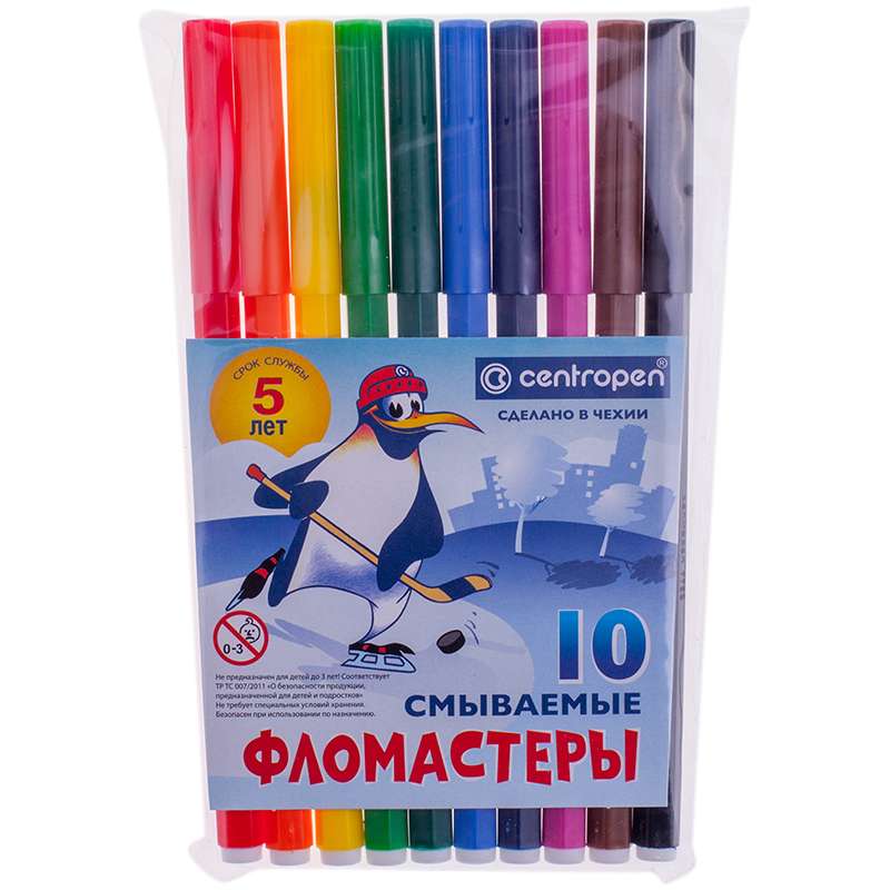 Фломастеры с вентилируемым колпачком. Фломастеры изготовлены из полипропилена, гарантия от высыхания – 3 года. Волокнистое остриё диаметром 1,8 мм, 10 цветов легко отстирывающихся чернил.Фломастеры Centropen "Пингвины", 10цв, смываемые, ПВХ