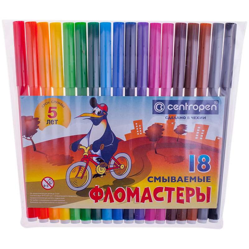 Набор фломастеров для детского творчества. Вентилируемый колпачок, чернила яркие, не токсичны. Фломастеры изготовлены из полипропилена, гарантия от высыхания – 3 года. Упаковка - блистер с европодвесом.Фломастеры Centropen "Пингвины", 18цв, смываемые, ПВХ