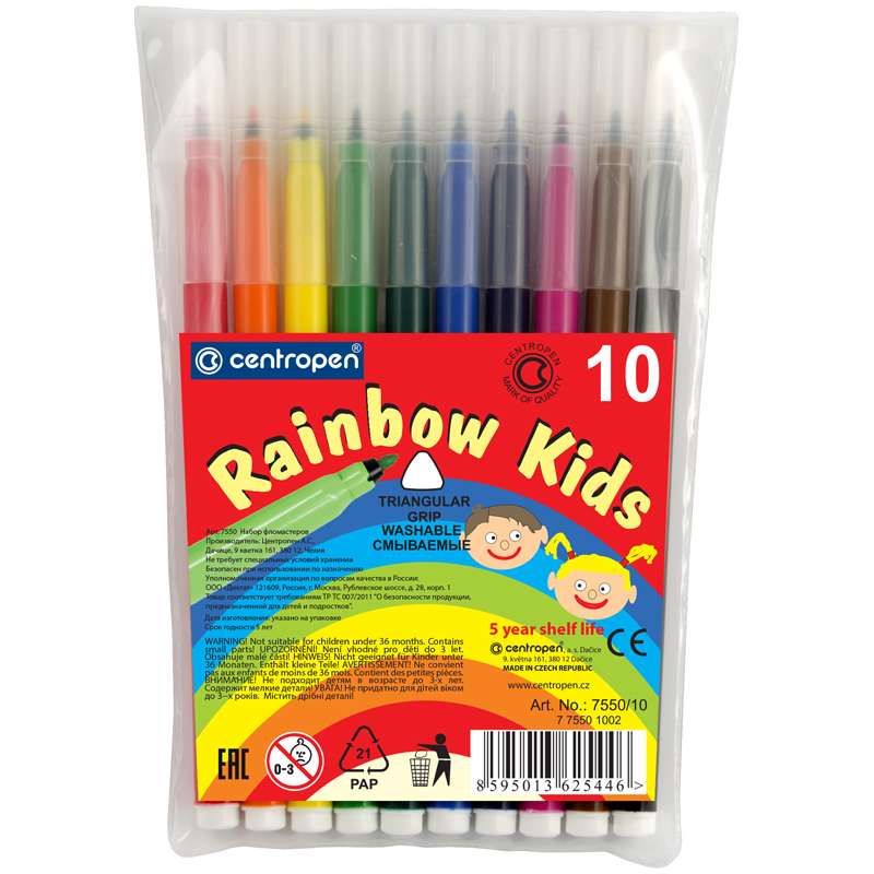 Цветные фломастеры. Эргономичная зона обхвата. Безопасные для здоровья чернила, не высыхают в течение 5 лет, смываемые, вентилируемый колпачок. Цилиндрический пишущий узел, устойчивый к вдавливанию. Толщина линии - 1 ммФломастеры Centropen "Rainbow Kids", 10цв, трехгранные, смываемые, ПВХ