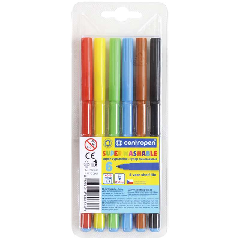 Легкосмываемые цветные фломастеры, безопасные для здоровья чернила, не высыхают в течение 5 лет, вентилируемый колпачок, цилиндрический пишущий узел, устойчивый к вдавливанию. Толщина линии - 1 мм.Фломастеры Centropen "Super Washable", 06цв., смываемые, блистер