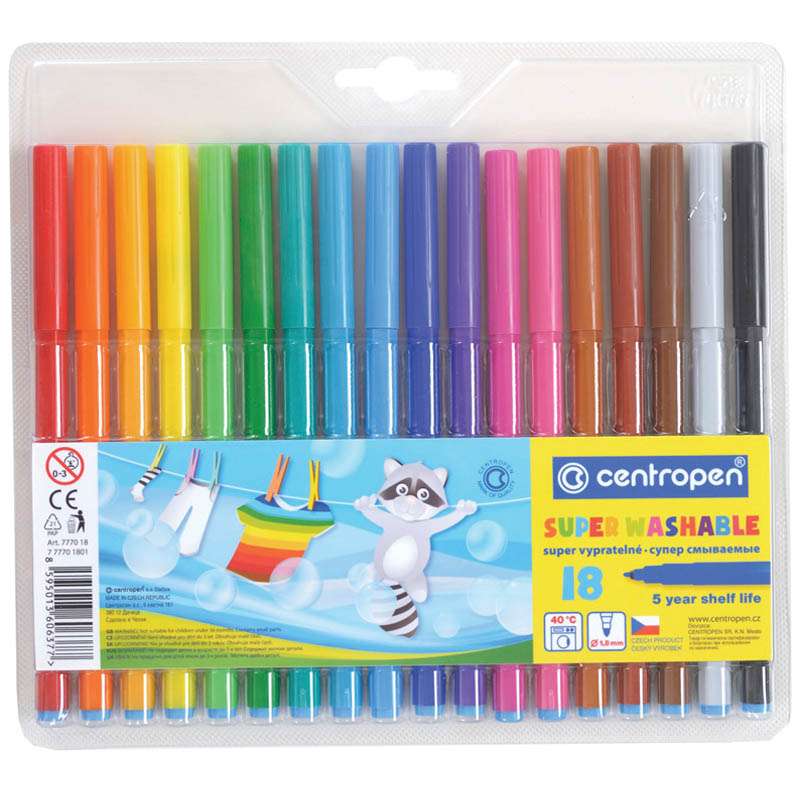 Легкосмываемые цветные фломастеры, безопасные для здоровья чернила, не высыхают в течение 5 лет, вентилируемый колпачок, цилиндрический пишущий узел, устойчивый к вдавливанию, толщина линии 1 мм.Фломастеры Centropen "Super Washable", 18цв., смываемые, блистер
