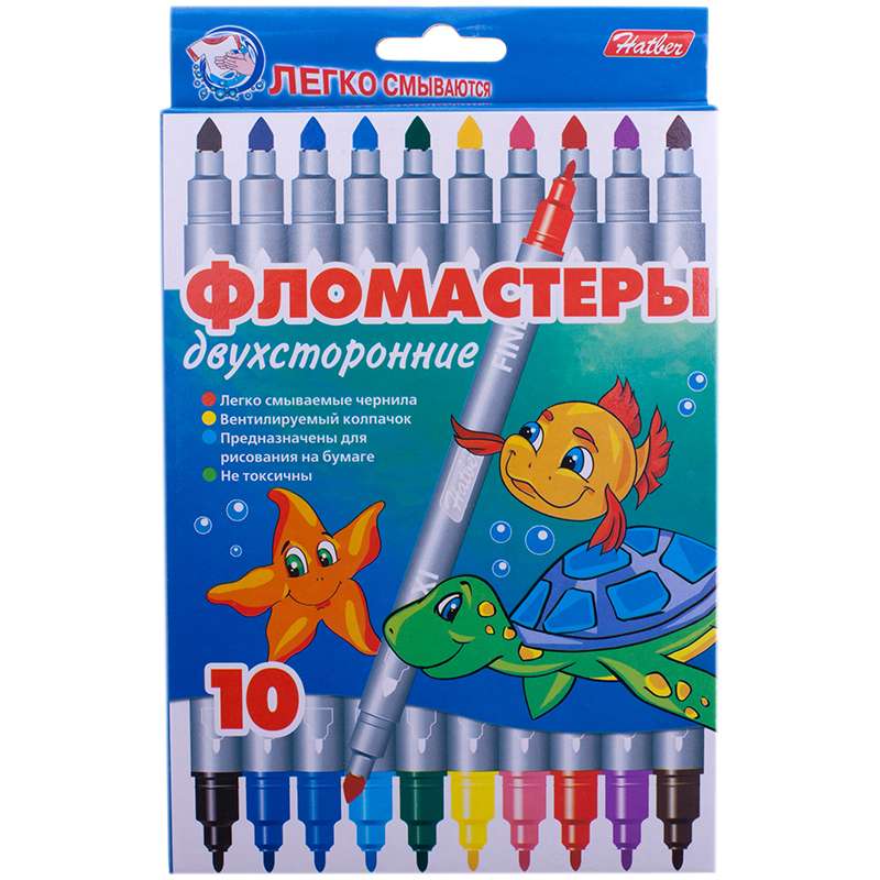 Набор фломастеров для детского творчества. Яркие цвета. Двусторонние фломастеры имеют два пишущих узла: тонкий и толстый, вентилируемые колпачки. Специальные чернила легко смываются водой с рук ребенка и отстирываются от одежды, не токсичны. Упакованы в лакированную картонную коробку с петлей-европодвесом.Фломастеры двусторонние Hatber "Морская семейка", 10цв., 10шт., смываемые, картон, европодвес