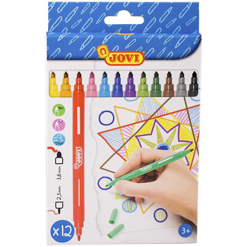 Набор двусторонних фломастеров с двумя пишушими узлами - 2,3 и 3,6 мм 12 цветов с особо прочным наконечником. Полностью безопасные гипоаллергенные чернила на водной основе с пищевыми красителями. Специальные вентилируемые колпачки обеспечивают прохождение воздуха при случайном проглатывании. Легко смываются с кожи и отстирываются с большинства видов тканей.Фломастеры двусторонние JOVI, 12цв, смываемые, картон, европодвес