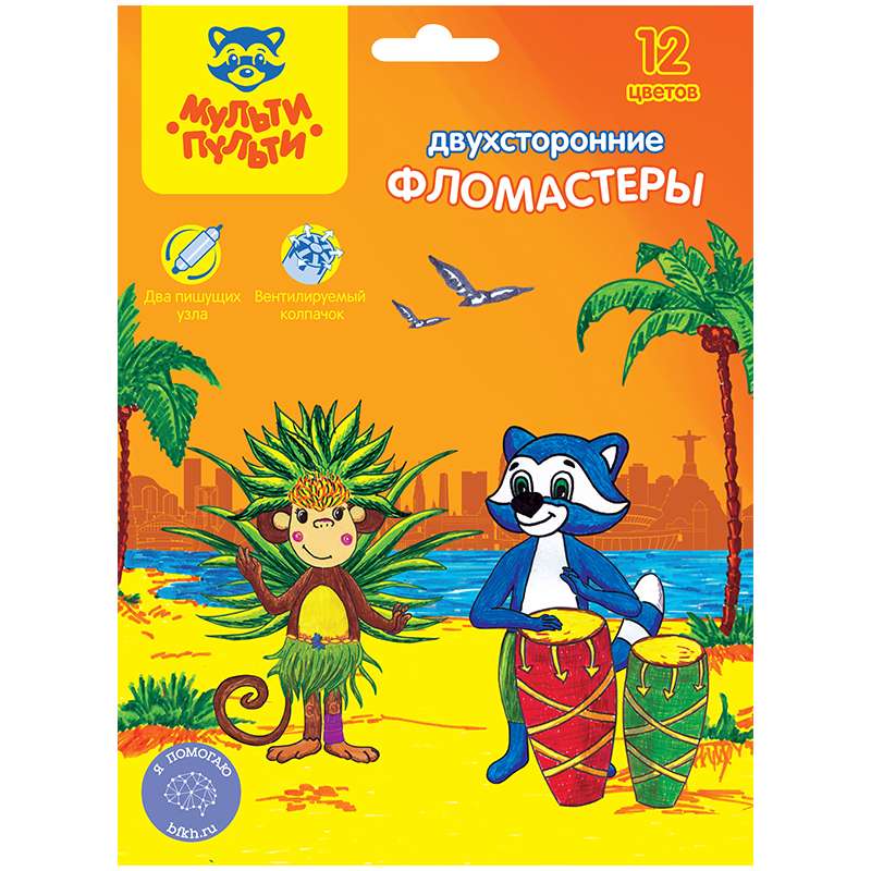 Набор фломастеров для детского творчества. Яркие цвета. Двусторонние фломастеры имеют два пишущих узла: тонкий и толстый, вентилируемые колпачки. Специальные чернила легко смываются водой с рук ребенка и отстирываются от одежды, не токсичны. Упакованы в лакированную картонную коробку с петлей-европодвесом.Фломастеры двусторонние Мульти-Пульти "Енот в Бразилии", 12цв, 12шт., смываемые, картон, европодвес