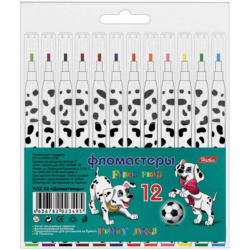 Легкосмываемые чернила, вентилируемый колпачок, не токсичны. На белых корпусах фломастеров нанесен оригинальный рисунок, который привлекает дополнительное внимание к продукции. Упаковка – блистер.Фломастеры Hatber "Далматинцы", 12цв, смываемые, блистер