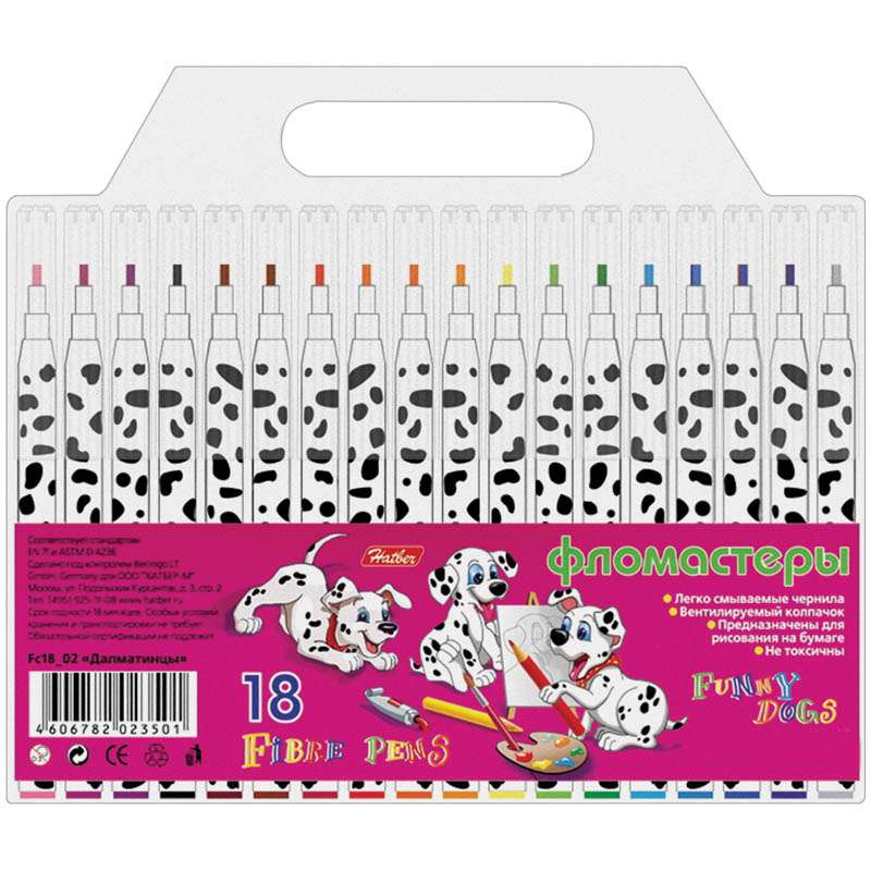 Набор фломастеров для детского творчества. Яркие цвета. Легкосмываемые чернила, вентилируемый колпачок, не токсичны. На белых корпусах фломастеров нанесен оригинальный рисунок, который привлекает дополнительное внимание к продукции. Упаковка – блистер.Фломастеры Hatber "Далматинцы", 18цв, смываемые, блистер