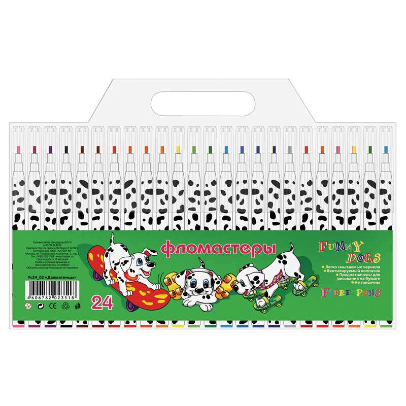 Набор фломастеров для детского творчества. Яркие цвета. Легкосмываемые чернила, вентилируемый колпачок, не токсичны. На белых корпусах фломастеров нанесен оригинальный рисунок, который привлекает дополнительное внимание к продукции. Упаковка – блистер.Фломастеры Hatber "Далматинцы", 24цв, смываемые, блистер