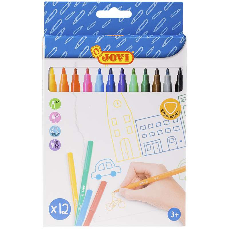 Набор фломастеров 12 цветов с особо прочным наконечником. Удобная треугольная форма зоны захвата эргономична, тренирует навык правильного захвата, снижает нагрузку на кисти рук. Полностью безопасные гипоаллергенные чернила на водной основе с пищевыми красителями. Не высыхают без колпачка в течение 96 часов. Длина письма 400 м. Специальный вентилируемый колпачок обеспечивает прохождение воздуха при случайном проглатывании. Легко смываются с кожи и отстирываются с большинства видов тканей.Фломастеры JOVI, 12цв, смываемые, картон, европодвес
