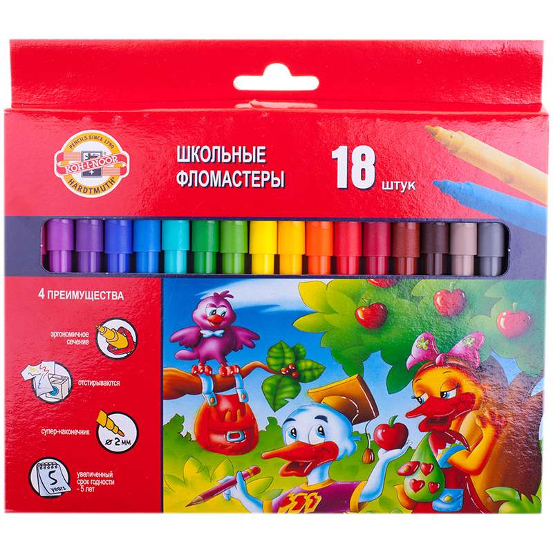 Главная / Товары / КАНЦТОВАРЫ / УПАКОВКА / ХОЗ ТОВАРЫ / РАСХОДНЫЕ МАТЕРИАЛЫ / Канцелярские товары - Школьные / Фломастеры / Фломастеры Koh-I-Noor "Утята", 18цв., трехгранные, смываемые, картон, европодвес