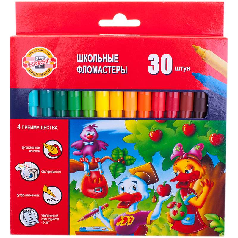 Главная / Товары / КАНЦТОВАРЫ / УПАКОВКА / ХОЗ ТОВАРЫ / РАСХОДНЫЕ МАТЕРИАЛЫ / Канцелярские товары - Школьные / Фломастеры / Фломастеры Koh-I-Noor "Утята", 30цв., трехгранные, смываемые, картон, европодвес