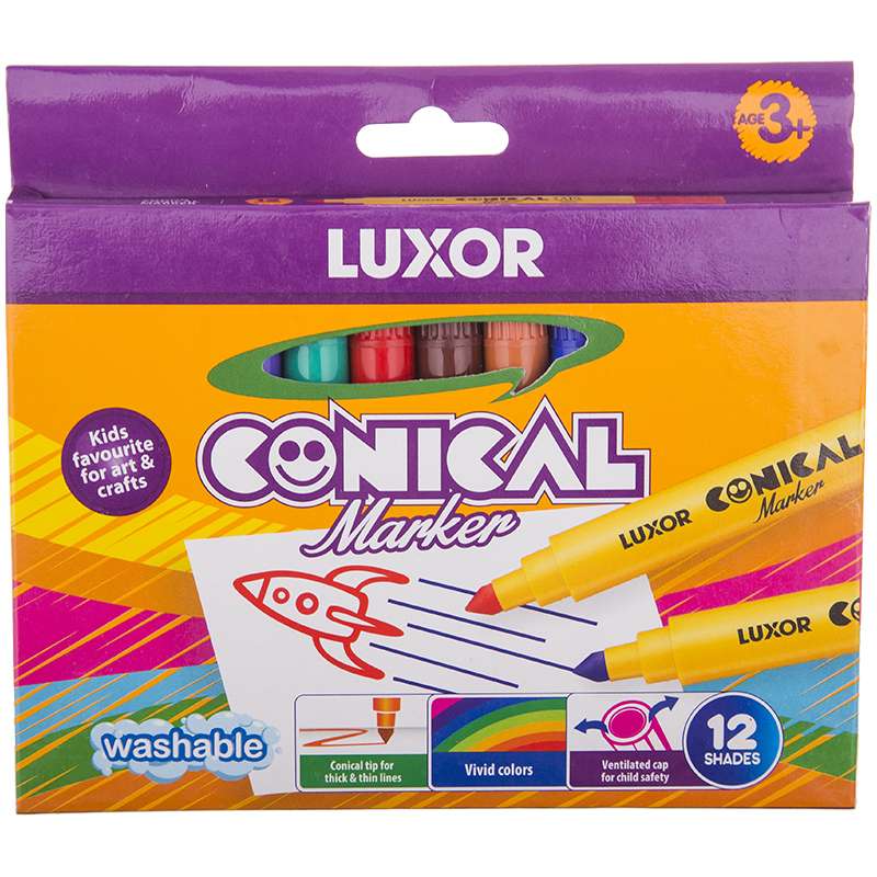 Фломастеры с нетоксичными смываемыми чернилами. Подходят для рисования тонких и толстых линий. Фломастеры имеют безопасный заблокированный пишущий узел. В наборе 12 цветов: желтый, фиолетовый, синий, черный, красный, фуксия, оранжевый, светло-зеленый, зеленый, светло-коричневый, голубой, коричневый.Фломастеры Luxor "Conical", 12цв, смываемые, картон, европодвес