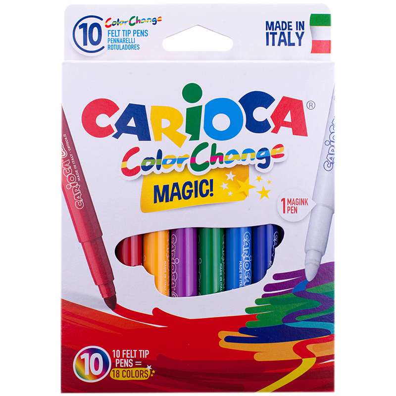 Набор фломастеров, меняющих цвет. В составе набора 9 цветных фломастеров и один волшебный фломастер, позволяющий менять цвета линий, нарисованных цветными фломастерамиФломастеры меняющие цвет Carioca "Color Change", 9цв+1, 10 шт., картон, европодвес