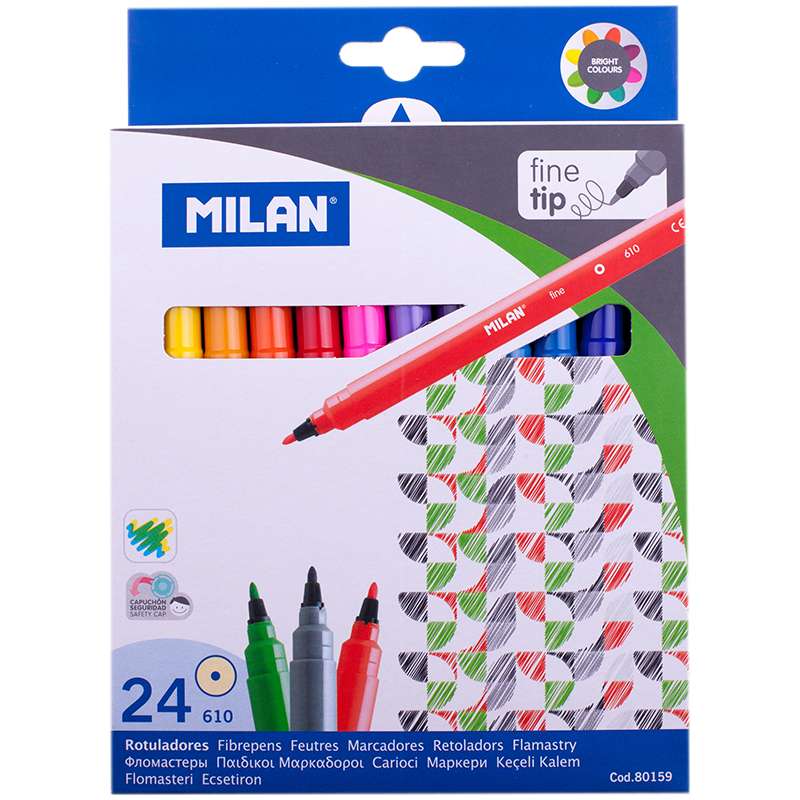 Нетоксичные и светостойкие фломастеры с яркими насыщенными цветами. Безопасный вентилируемый колпачокФломастеры Milan "610", 24цв, смываемые, картон, европодвес