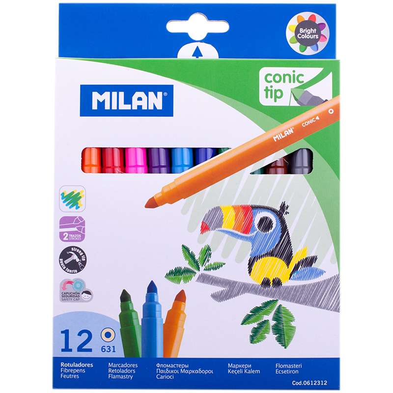 Яркие фломастеры с коническим наконечником диаметром 5 мм можно использовать для рисования тонких линий 0,75 мм или более толстых до 3 мм. Чернила на водной основе. Яркие цветаФломастеры Milan "631", 12цв., смываемые, картон, европодвес
