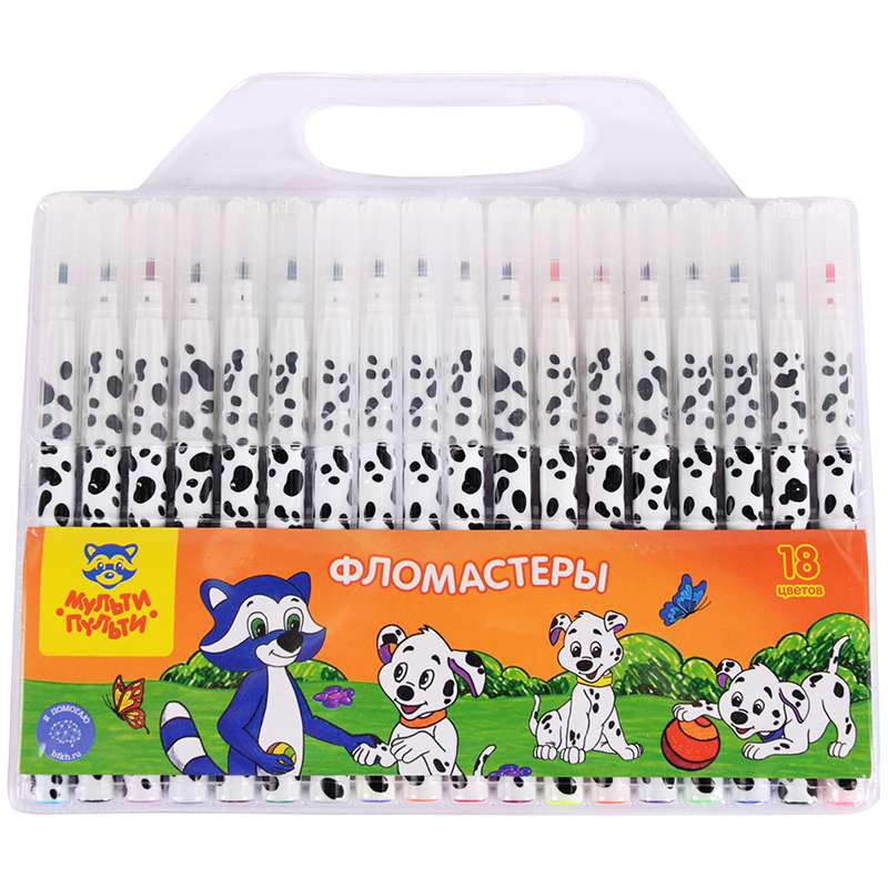 Главная / Товары / КАНЦТОВАРЫ / УПАКОВКА / ХОЗ ТОВАРЫ / РАСХОДНЫЕ МАТЕРИАЛЫ / Канцелярские товары - Школьные / Фломастеры / Фломастеры Мульти-Пульти "Енот и далматинцы", 18цв., смываемые, блистер